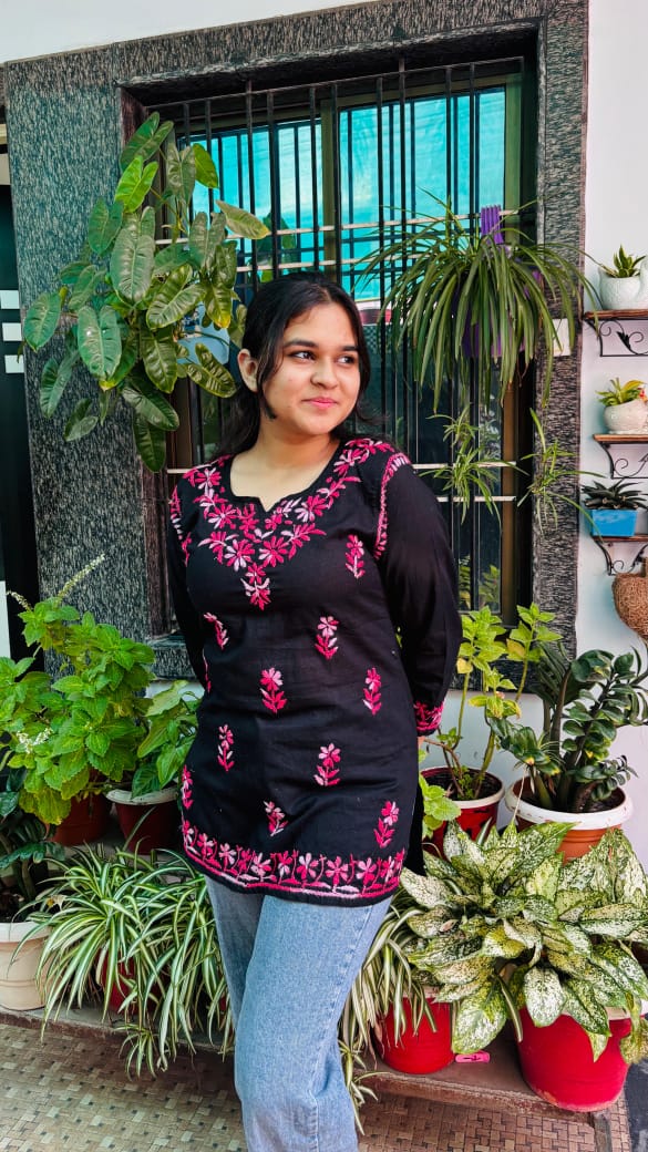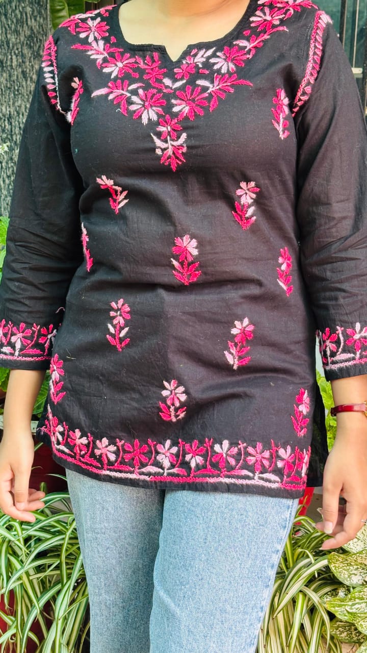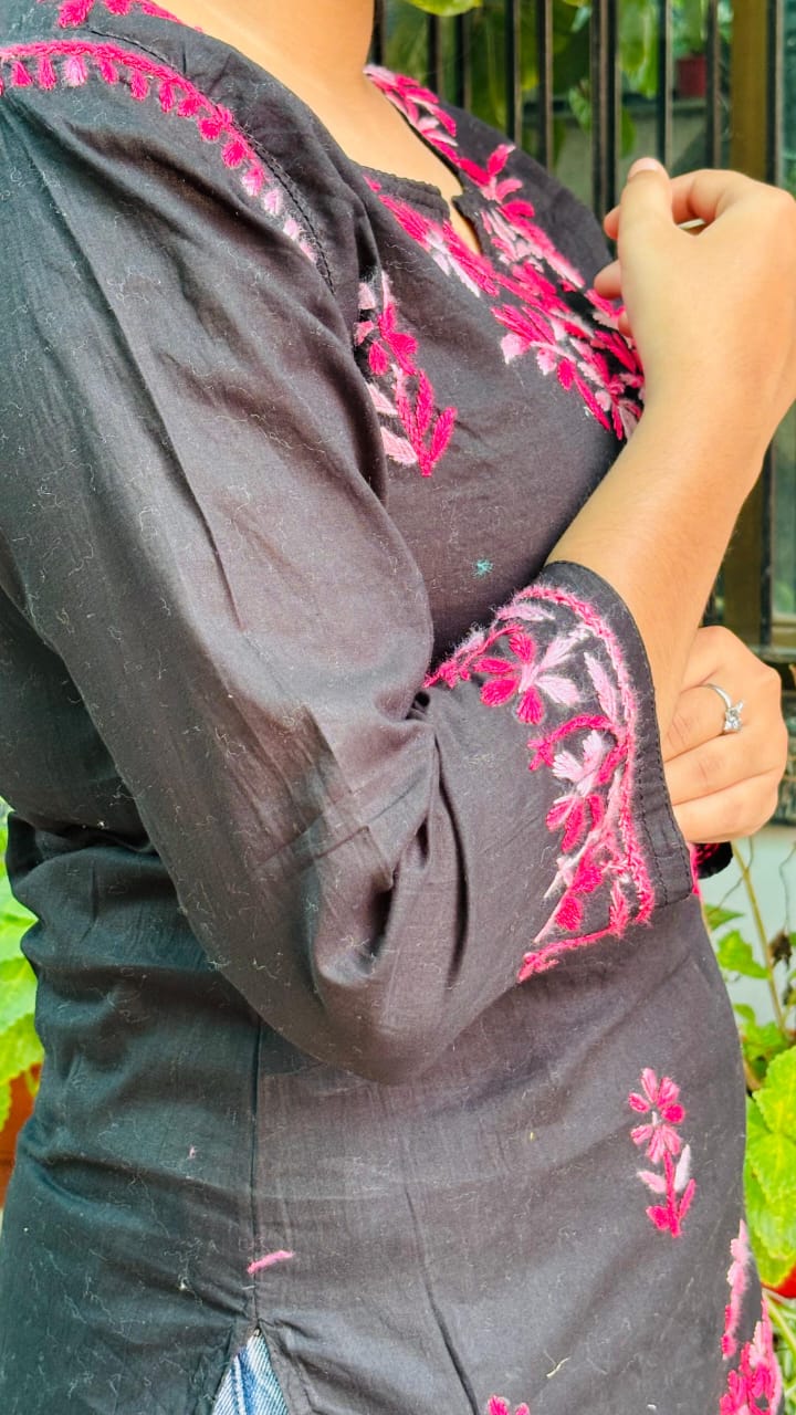 Midnight Bloom Short Kurti, crafted in rich black cotton and adorned with vibrant pink and rose thread floral embroidery. Featuring detailed neckline, sleeve, and border work, this kurti blends tradition with a bold, modern flair. Pair it with jeans, palazzos, or trousers for a chic Indo-Western look.