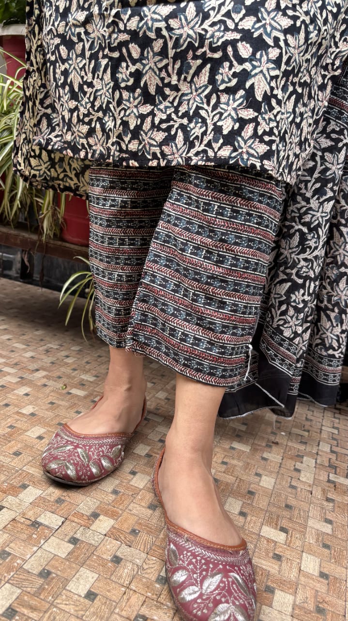 The Black Floral Print Jaipuri Cotton Dupatta Set exudes a refreshing charm with its soothing lavender base and intricate floral handblock-style prints in soft pink, green, and white. The kurta features a classic V-neckline and 3/4th sleeves, paired with matching straight-fit pants for a coordinated look. The contrast dupatta in a deeper magenta tone with delicate motifs adds a striking yet balanced pop of color. Crafted from breathable pure cotton, this set offers all-day comfort, making it perfect for office wear, casual outings, or festive gatherings.