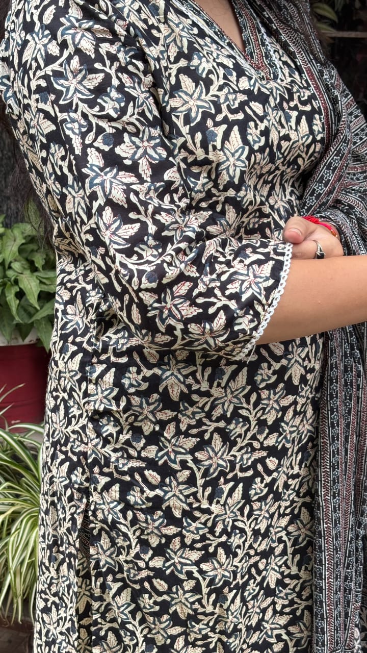 Black Floral Print Jaipuri Cotton Dupatta Set