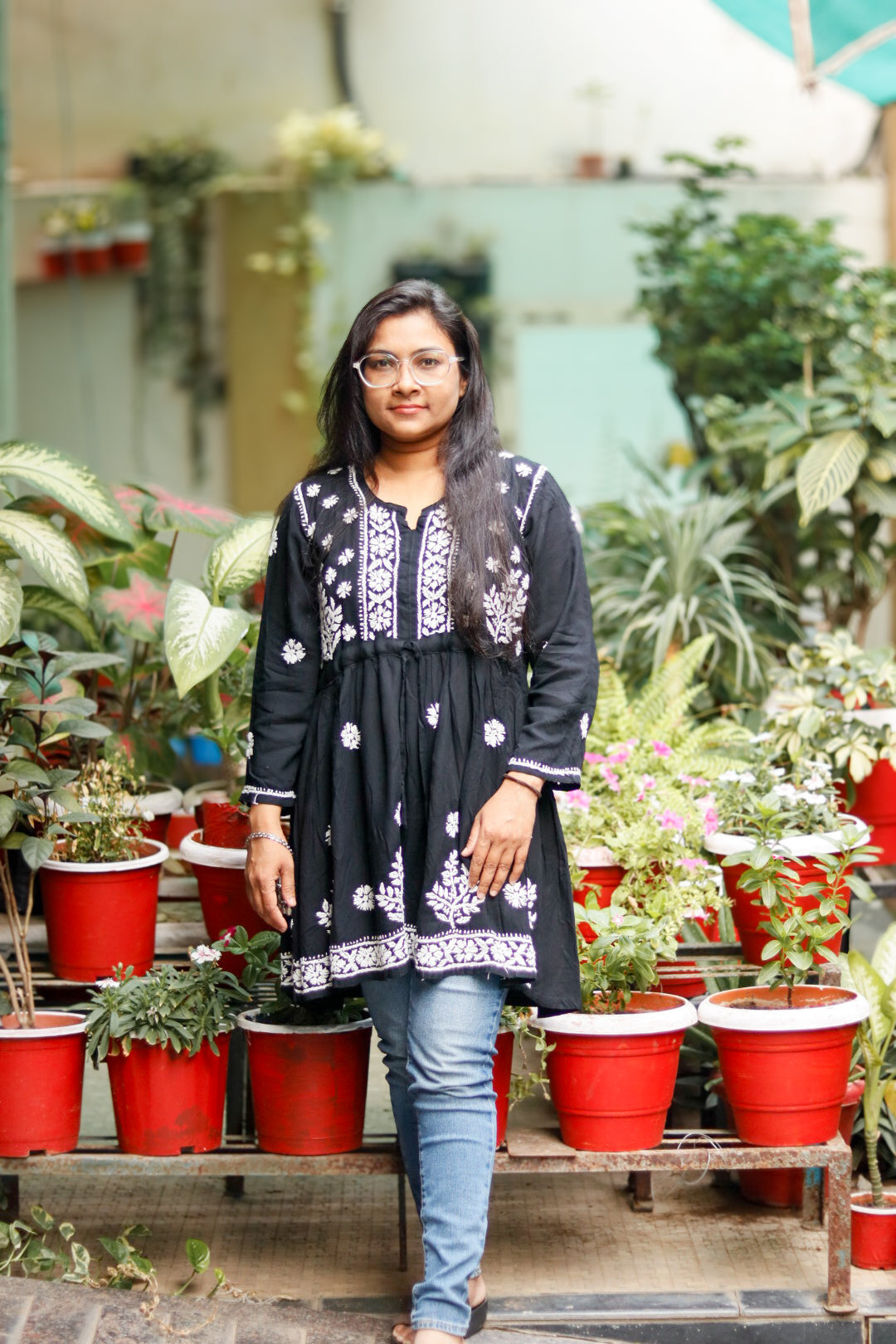 black short kurti with chicken kaai hand work with adjustable dori for women.